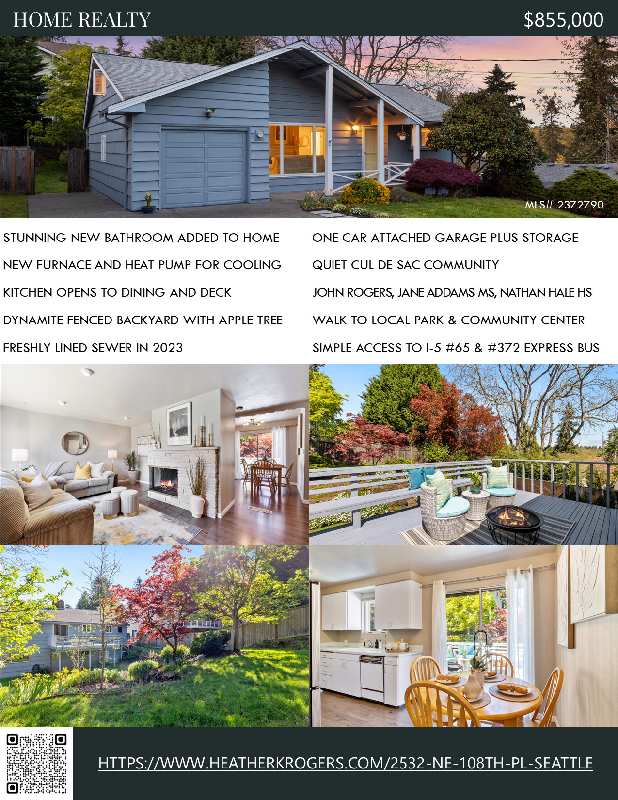 Welcome home! This spacious mid-century modern gem is nestled on a sunny south-facing lot, offering ample space to play in both the front and back yards with fruit bearing apple tree, blackberry, and raspberry bushes. Located on a quiet cul-de-sac community in Meadowbrook, you'll love coming home to this inviting play street. The main level features a living room with a fireplace and massive windows to let all the natural light pour in! There are also two bedrooms, a full bathroom, kitchen, and dining area that opens to a deck for a comfortable main level floorplan. The pantry and laundry room lead up to a third bedroom. The lower level is complete with a new 3/4 bathroom, an additional bedroom, rec room, and family room, providing plenty of space to relax or exercise. Don’t miss your own private wine cellar with space for 180 bottles, bar, and ample priceless storage. To top it all off, this home includes a new furnace, a freshly lined sewer, and an attached garage. Schools include John Rogers Elementary which will open in a brand-new building fall 2025. All a short walk to the incredible Meadowbrook playfields, park, playground, community center, pool, Jane Addams Middle School, and Nathan Hale High School.