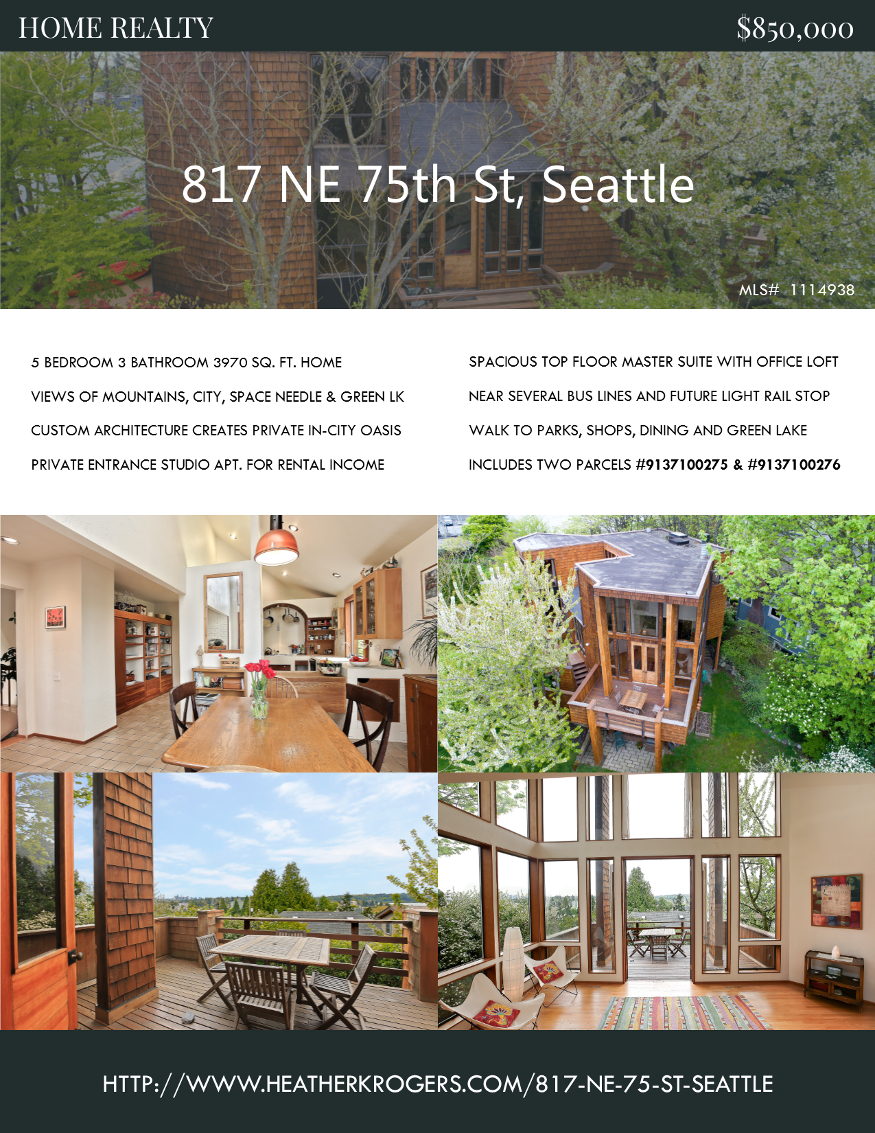 Soak in the sun and take in the view from your spacious home and deck. Enjoy the spectacular panorama of Green Lake, Seattle, and mountains through an array of floor-to-ceiling windows. There is plenty of room to spread out on many levels in this custom home. The top floor master suite and loft/office have magnificent views. The lower level includes 3 bedrooms, rec room and a separate mother-in-law studio with private entrance. New hardwood floors on upper levels. This urban retreat offers easy access to Green Lake, I-5, Seattle, South Lake Union, UW and the future Roosevelt light rail station.